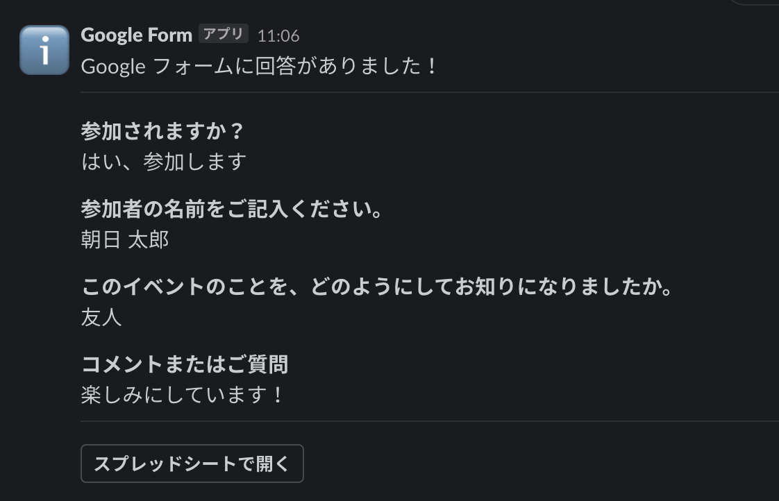 問題無くフォームへの提出内容がSlackに到達していることを確認出来ました!