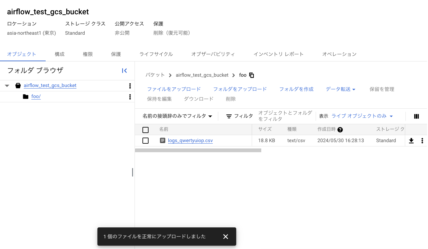 ここで、logs_[ランダム文字列].csvを満たすファイルをGCSにアップロードしてみます。