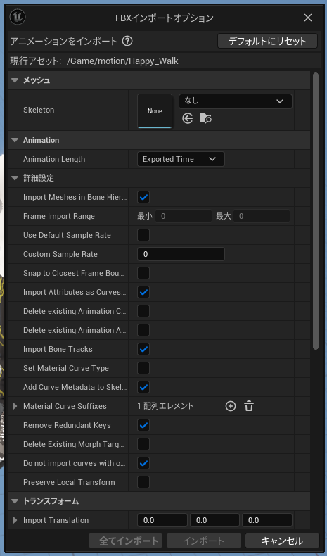 「Animation > 詳細設定 > Import Bone Tracks」のチェックを入れる